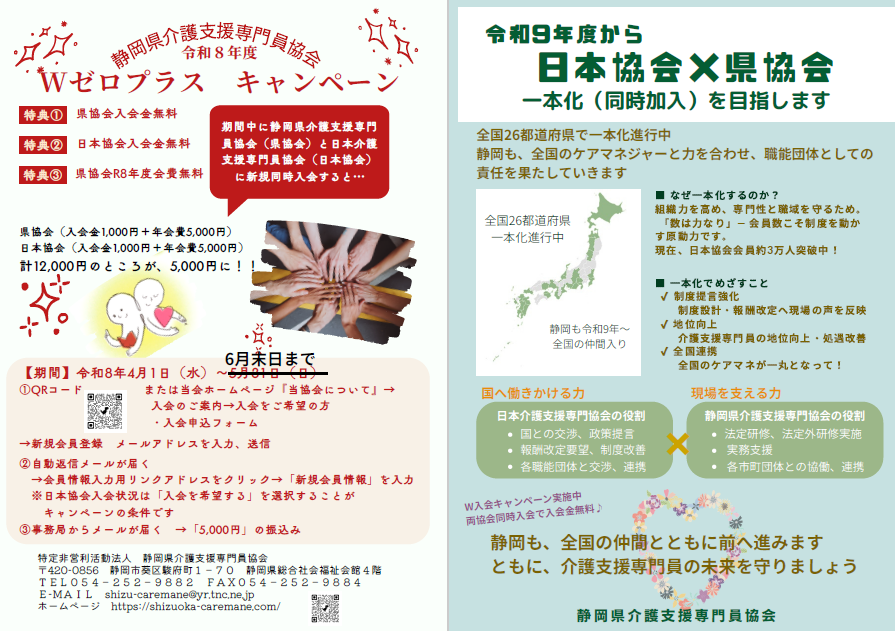 静岡県介護支援専門員協会と日本介護支援専門員協会に新規同時入会で、両団体の入会金が0円、さらに県協会年会費が無料となるキャンペーンを開催します!